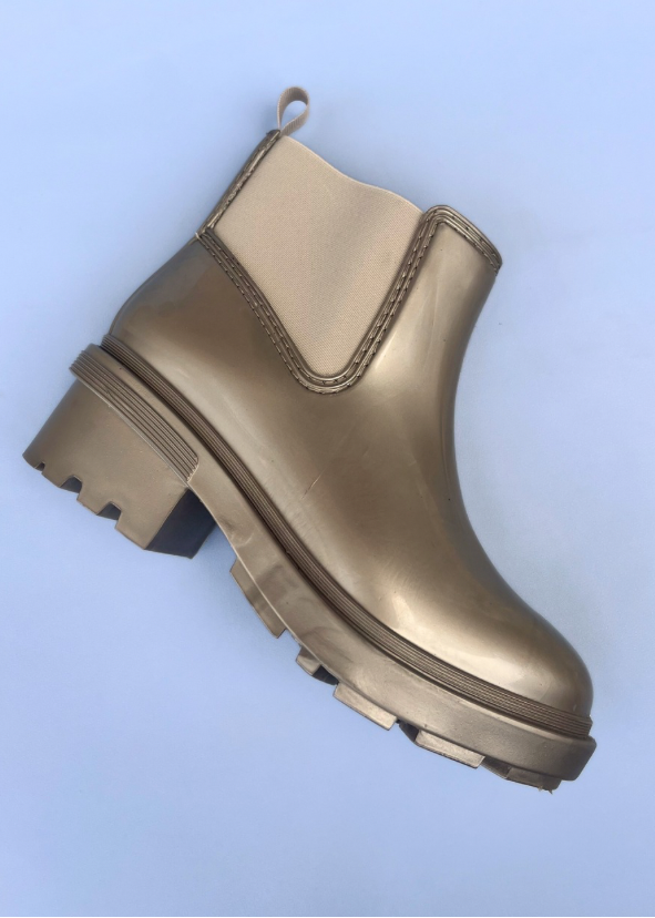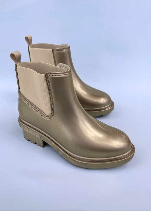 Las botas Charlotte combinan un acabado brillante con una suela gruesa tipo chunky que aporta estilo y soporte. Están hechas de un material plástico suave, flexible y resistente al agua, ideal para climas húmedos o para el uso diario.