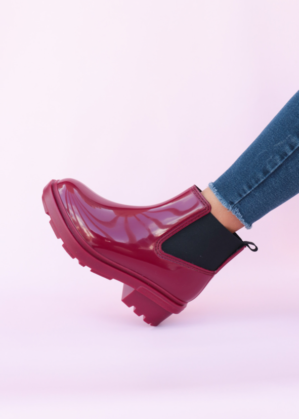 Las botas Charlotte combinan un acabado brillante con una suela gruesa tipo chunky que aporta estilo y soporte. Están hechas de un material plástico suave, flexible y resistente al agua, ideal para climas húmedos o para el uso diario.