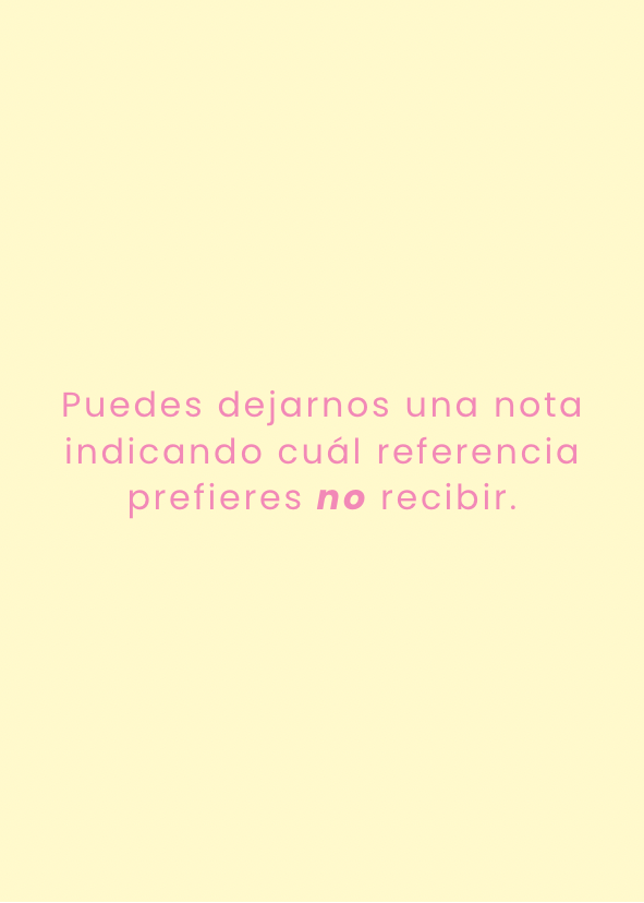 El cliente podrá seleccionar únicamente la talla. Puedes dejarnos una nota indicando cuál referencia prefieres no recibir. Trataremos de acomodar tu solicitud, sujeto a disponibilidad.
