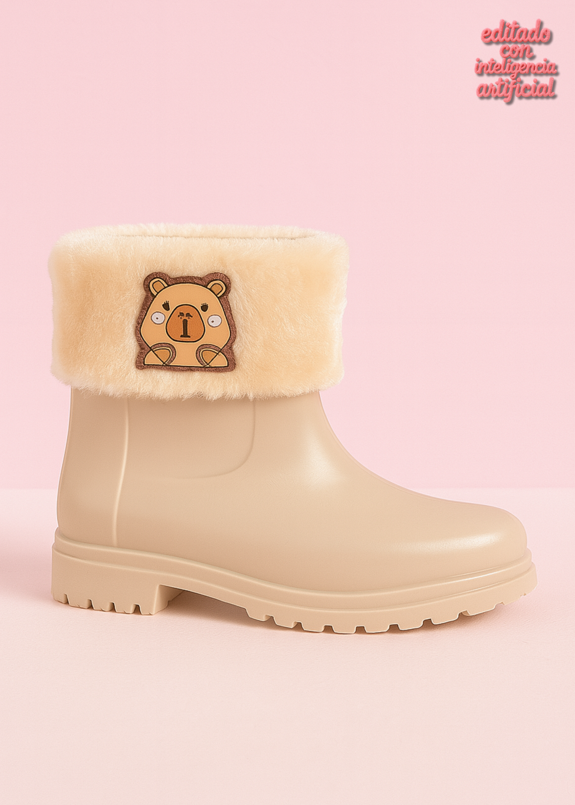 Mantén los pies de tu pequeño secos y con estilo en días lluviosos. Nuestras botas impermeables para niñas cuentan con un forro de peluche y un tierno aplique de capibara, que combina comodidad y diversión.